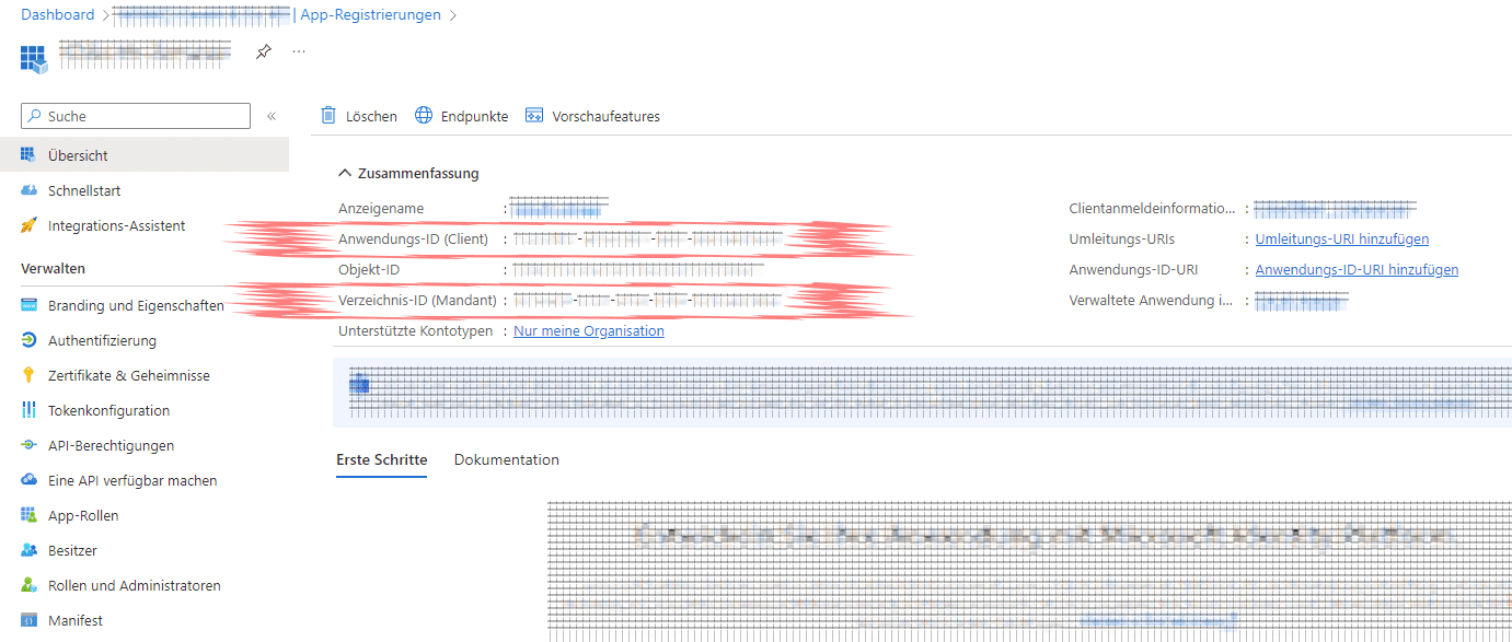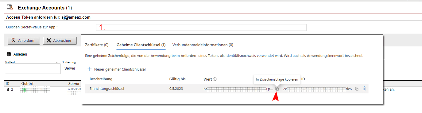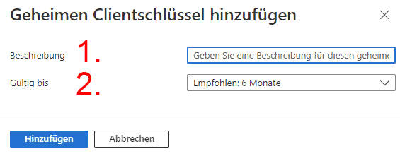 Bitte beachten Sie, dass zur Einrichtung ein gültiger geheimer Clientschlüssel verwendet werden muss und dieser eine Laufzeit hat (standardmäßig 6 Monate, die Laufzeit haben Sie im Schritt 1.5 selbst angegeben). Sollte dieser Schlüssel abgelaufen sein, so müssen Sie einen neuen Schlüssel wie in Schritt 1.5 anlegen.
