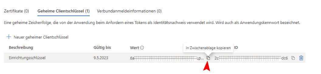 Wenn Sie das Azure Active Directory Admin Center verlassen und wieder öffnen, ist der Wert nicht mehr auslesbar. Es ist also sehr wichtig, dass Sie diesen Wert sofort kopieren und sich in Ihren sicheren Unterlagen vermerken, zusammen mit dem Gültigkeitszeitraum.