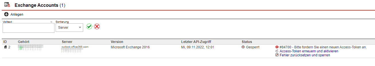 Derzeit ist Ihr Exchange-Konto mit dem ameax-Konto verknüpft, aber gearbeitet werden kann noch nicht, da noch kein Access-Token vorhanden ist. Daher steht im Status „Gesperrt“ und als Meldung der Hinweis „Bitte fordern Sie einen neuen Access-Token an“.