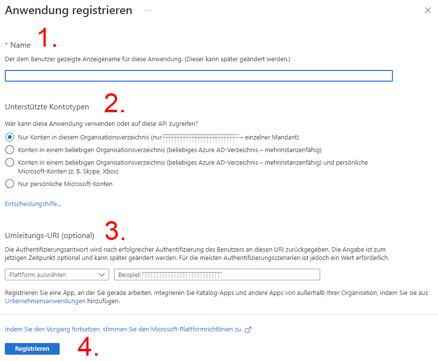Hier benötigen Sie keine Einstellungen. Lassen Sie beide Felder leer. - Klicken Sie danach auf den Button „Registrieren“ (4) am Ende des Formulars.