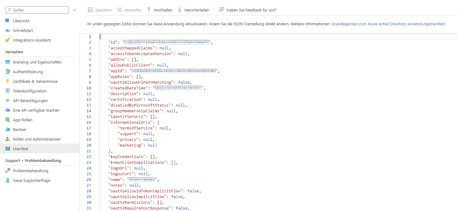 Damit die ameax-Software auf die Inhalte des Kontos zugreifen kann, muss der App nun Zugriff auf bestimmte Daten gewährt werden. Dazu klicken Sie bitte im zweiten Menü auf „Manifest“. Es öffnet sich folgender Bildschirm: