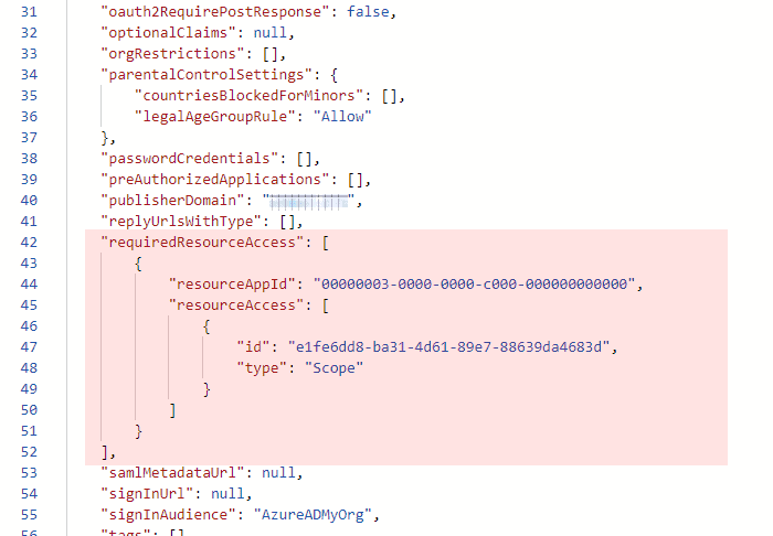 Suchen Sie bitte den Bereich, der mit „requiredResourceAccess“ beginnt und mit einer eckigen Klammer und einem Komma endet.