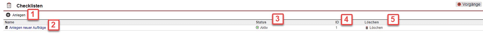 In der Übersichtsmaske findet man alle erstellten Checklisten. Um neue anzulegen, klicken Sie auf die gleichnamige Schaltfläche [Abb. 2/1].