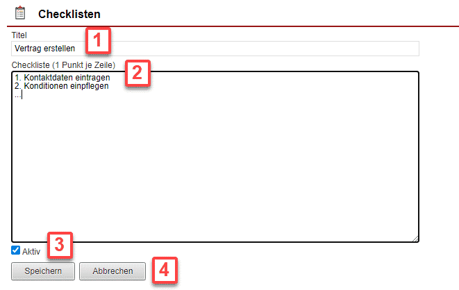 Zum Anlegen einer Checkliste vergeben Sie zuerst einen Titel [Abb. 2/1]. Anschließend führen Sie die gewünschten Inhaltspunkte auf [Abb. 2/2]. Jede Zeile wird später als ein einzelner Punkt auf der Checkliste dargestellt. Durch das Setzen des Hakens bei „Aktiv“ [Abb. 2/3] wird eine Checkliste einsatzbereit. Durch die Schaltfläche „Speichern“ wird die Checkliste erstellt. Mit einem Klick auf den Button „Abbrechen“ [Abb. 2/4] wird diese verworfen.