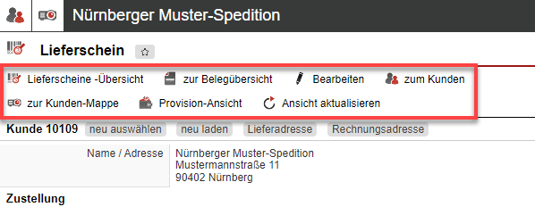 Im Abschnitt über dem Bereich „Kunden“ haben Sie verschiedene Schaltflächen, mit denen Sie zur Lieferschein- oder Belegübersicht kommen, den Lieferschein bearbeiten können, zum Kundendatensatz gelangen beziehungsweise in dessen Kunden-Mappe. Sollten Sie die Provision Struktur des Belegs einsehen oder die Ansicht aktualisieren wollen, klicken Sie dort auf den entsprechenden Button.