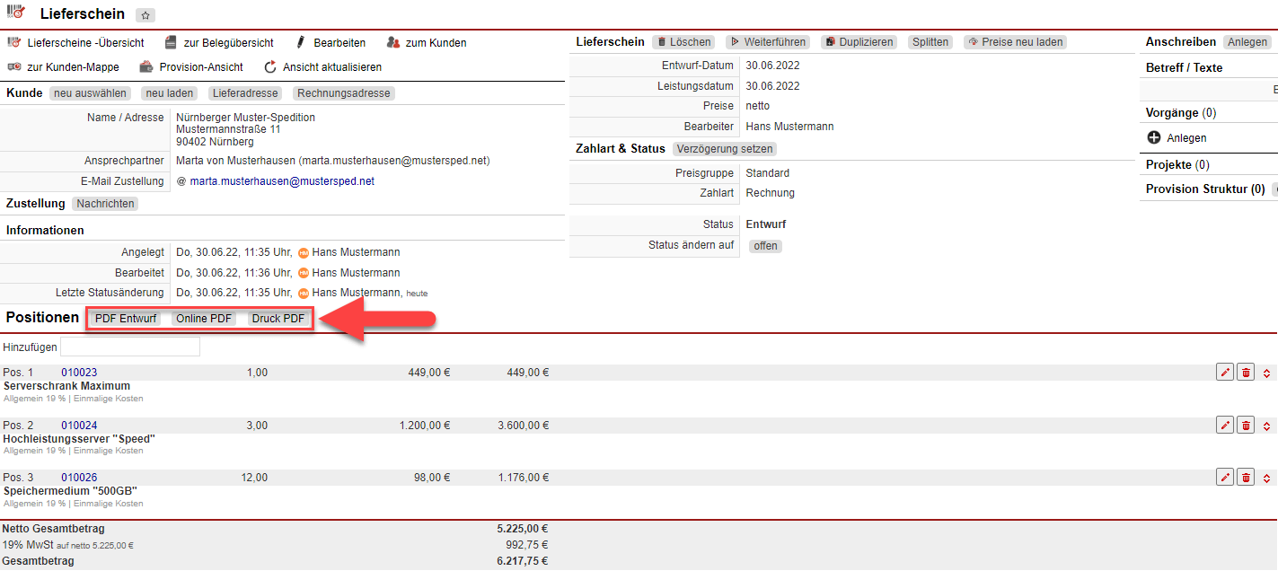 Über den „PDF Entwurf“-Button gelangen Sie in die PDF-Ansicht des Belegs und können diese auf Ihre Vollständigkeit überprüfen. Als Briefpapier wurde in den Einstellungen ein Muster Briefpapier verwendet, welches individuell abgeändert werden kann. Unter Briefpapier erhalten Sie eine Vorgangsbeschreibung zur Änderung von diesem.