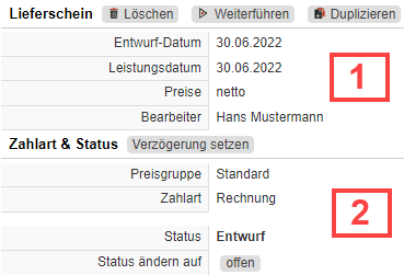 Im Bereich „Lieferschein“ sehen Sie alle Voreinstellungen des Belegs und können diesen in einen anderen „Weiterführen“. Sie haben zudem zwei weitere Schaltflächen zum „Löschen“ und „Duplizieren“ des Lieferscheins [Abb. 13/1]. Wenn der Status bereits auf „offen“ gesetzt wurde, kann der Beleg lediglich nur noch storniert werden. Buttons zur Statusänderung finden Sie neben den Zahlungskonditionen im Abschnitt „Zahlart & Status“ [Abb. 13/2].