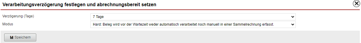 Um eine Verzögerung im Lieferschein zu berücksichtigen, betätigen Sie die Schaltfläche im Bereich „Zahlart & Status“. Es öffnet sich eine Anlagemaske zum Setzen einer Verarbeitungsverzögerung. Bestimmen Sie über die beiden Drop-Down-Menüs die „Verzögerung in Tage“ und den „Modus“. Der Modus dient dazu, festzulegen, ob der Beleg bereits bei einer Sammelrechnung erfasst werden soll oder bis zur Fertigstellung dort unberücksichtigt bleibt.
