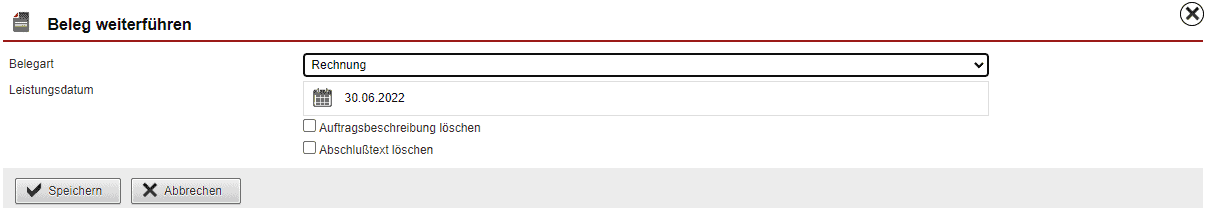 Zur Weiterführung eines Belegs, deklarieren Sie über das Drop-Down-Menü die „Belegart“, bestimmen das neue Leistungsdatum und entfernen bei Bedarf durch Auswahl der Checkboxen die „Auftragsbeschreibung“ beziehungsweise den „Abschlusstext“.