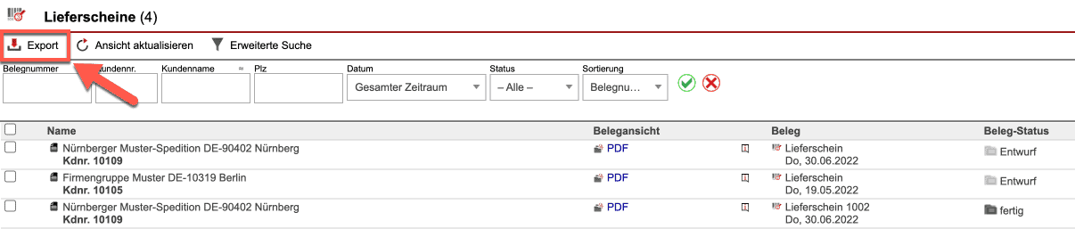 Für einen Export aller Lieferscheine klicken Sie auf den Button „Export“. Es wird eine CSV-Datei mit sämtlichen Daten zu allen Lieferscheinbelegen erstellt. Dazu zählen unter anderem Angaben zum Empfänger und dem Betrag.