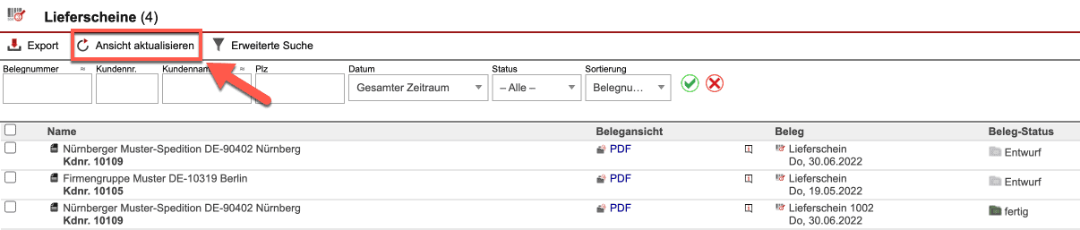 Um die Seite zu aktualisieren und neu erstellte Lieferscheine zu laden, klicken Sie auf den Button „Ansicht aktualisieren“.
