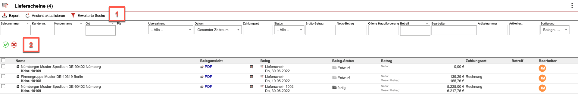 Grenzen Sie die angezeigten Lieferscheine ein, indem Sie nach bestimmten Kriterien über die Texteingabefelder filtern. Um mehr Filtermöglichkeiten zu erhalten, klicken Sie auf „Erweiterte Suche“.
