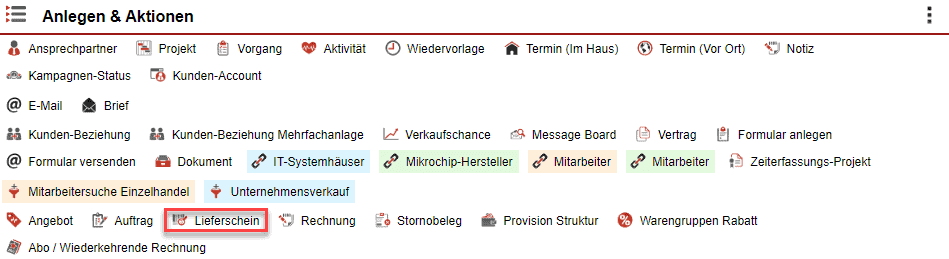 Im Kundendatensatz können Sie über den „Anlegen & Aktionen“-Bereich einen Lieferschein anlegen. Klicken Sie dazu auf den gleichnamigen Button.