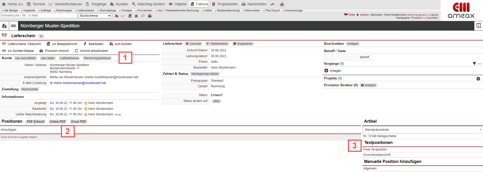 Nach dem Abspeichern der Voreinstellungen öffnet sich die Anlagemaske des Belegs. Zum Hinterlegen einer abweichenden Lieferanschrift beziehungsweise Rechnungsadresse, klicken Sie dafür auf die jeweilige Schaltfläche und tragen die Adresse in der sich öffnenden Bearbeitungsmaske ein [Abb. 9/1]. Um den Lieferschein mit Artikeln zu bestücken, geben Sie entweder die Artikelnummer beziehungsweise Bezeichnung in die Suchzeile ein [Abb. 9/2] oder wählen über das Drop-Down-Menü auf der rechten Seite der Bearbeitungsmaske eine Kategorie aus und klicken den gewünschten Artikel an [Abb. 9/3]. Hier stehen Ihnen auch verschiedene Bausteine für Textpositionen zur Verfügung, um Zwischenüberschriften und zusätzliche Beschreibungen zu ergänzen.