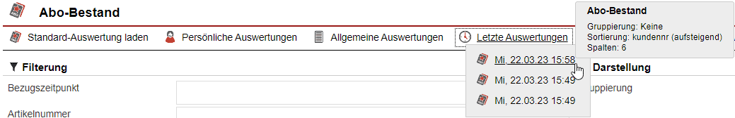 Über „Allgemeine Auswertungen“ [Abb. 2/3] können gespeicherte Auswertungen die als „Allgemeine Auswertung“ [Abb. 5/2] gekennzeichnet worden sind, über ein Tooltipp-Menü abgerufen werden.