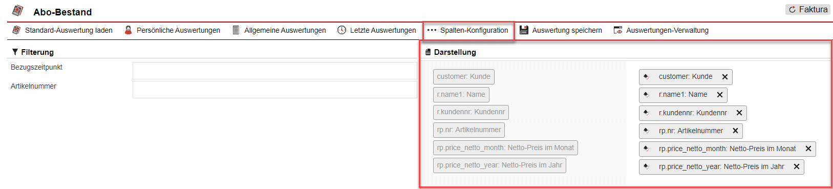 Über den Button „Spalten-Konfiguration“ [Abb. 2/5] ist es möglich, die Auswertung sowie den Umfang der Informationen schnell und einfach nach den eigenen Wünschen anzupassen [Abb. 4]. Mit nur wenigen Mausklicks lassen Sie Spalten aus der Anzeigemaske verschwinden oder fügen andere hinzu.