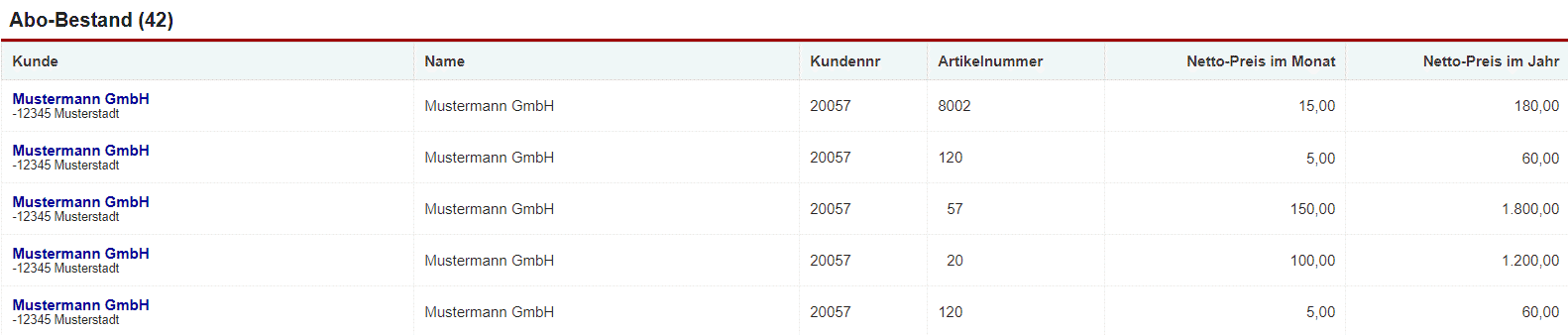 In der Statistik „Abo-Bestand“ finden Sie eine übersichtliche und detaillierte Auflistung der aktiven Abonnements/Wiederkehrenden Rechnungen von Ihren Kunden. Erreichbar ist die Statistik „Abo-Bestand“ im Hauptmenüpunkt „Statistik“ unter „Faktura“ bei „Abo-Bestand“.