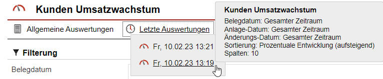 Über „Allgemeine Auswertungen“ [Abb. 2/3] können gespeicherte Auswertungen die als „Allgemeine Auswertung“ [Abb. 5/2] gekennzeichnet worden sind, über ein Tooltipp-Menü abgerufen werden.