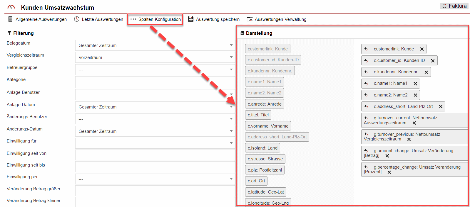 Über den Button „Spalten-Konfiguration“ [Abb. 2/5] ist es möglich, die Auswertung sowie den Umfang der Informationen schnell und einfach nach den eigenen Wünschen anzupassen [Abb. 4]. Mit nur wenigen Mausklicks lassen Sie Spalten aus der Anzeigemaske verschwinden oder fügen andere hinzu.