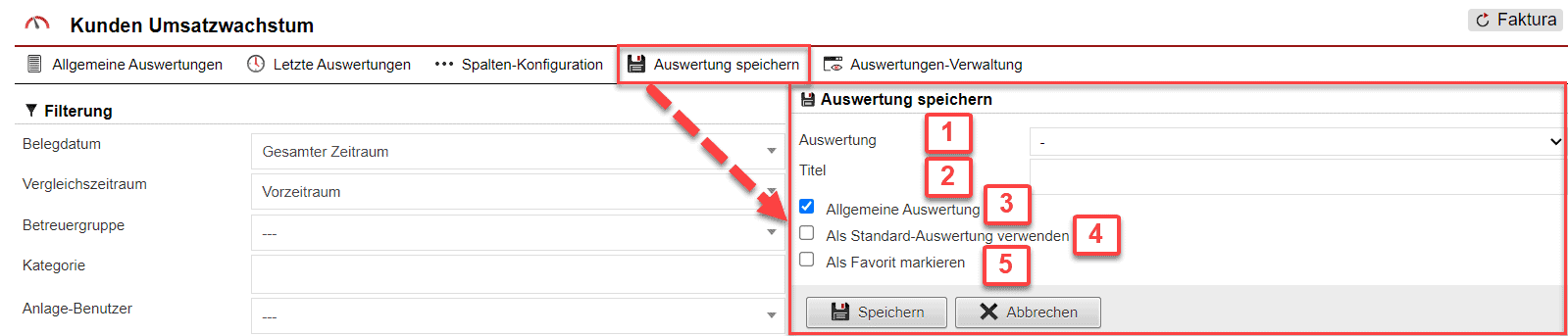 Über die Schaltfläche „Auswertung speichern“ kann man die konfigurierte Auswertung für die Zukunft als Voreinstellung speichern, um auf diese schnell zugreifen zu können. Hierfür kann eine bereits vorhandene Auswertung durch Auswahl Ihres Titels aus einem Drop-Down-Menü überspeichert werden [Abb. 5/1]. Ebenso ist die Eingabe eines Titels machbar [Abb. 5/2], wodurch eine neue Auswertungskonstellation gespeichert wird. Über die folgenden Checkboxen sind genauere Konfigurationen, wie „Allgemeine Auswertung“ [Abb. 5/3] (Auswertungskonstellation für alle System-User nutzbar), „Als Standard-Auswertung verwenden“ [Abb. 5/4] und die Möglichkeit, die Auswertung als Favorit zu markieren gegeben [Abb. 5/5]. Über die Schaltfläche „Speichern“ können die Informationen gespeichert und über die Schaltfläche „Abbrechen“ wieder verworfen werden.