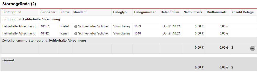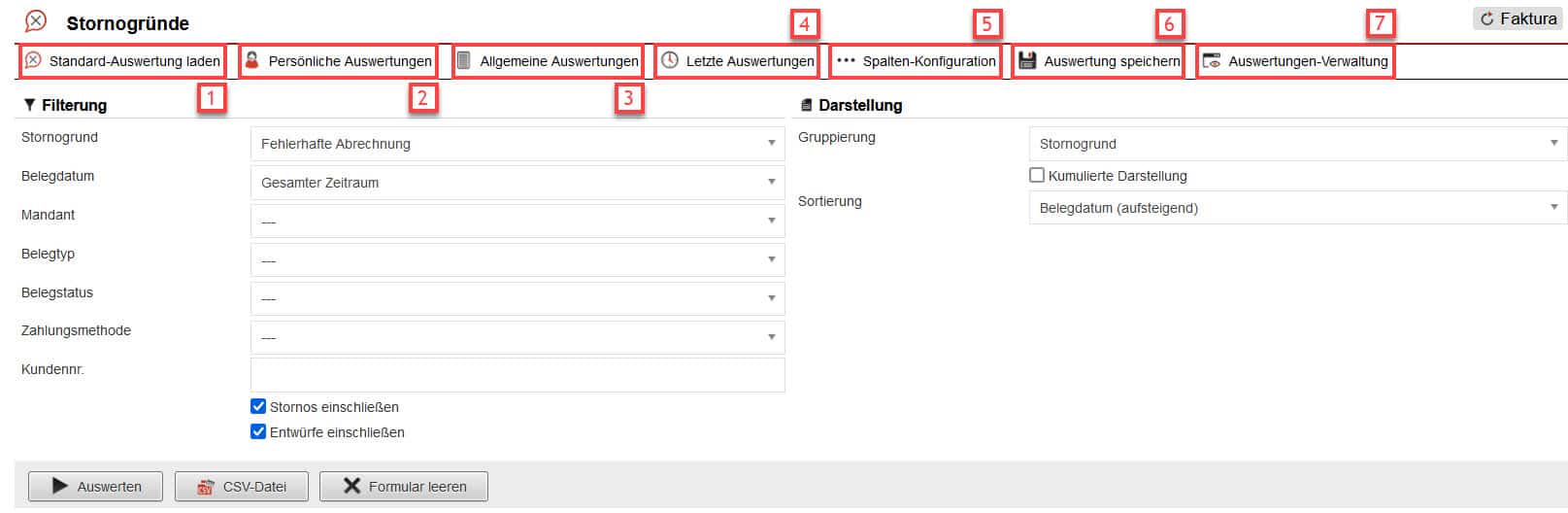 In der „Stornogründe-Statistik“ finden Sie eine detaillierte Auswertung der im System hinterlegten Stornobelege nach verschiedenen Kriterien. Erreichbar ist die Stornogründe-Statistik im Hauptmenüpunkt „Statistik“ unter „Faktura“, bei „Stornogründe“.