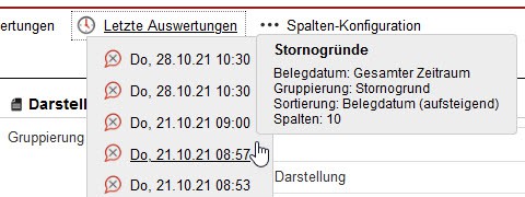 Über die Schaltfläche „Persönliche Auswertungen“ [Abb. 2/2] können gespeicherte Auswertungen, die nicht als allgemein gekennzeichnet wurden, sondern nur dem eigenen Benutzer-Account zugeordnet sind, über ein Tooltipp-Menü abgerufen werden.