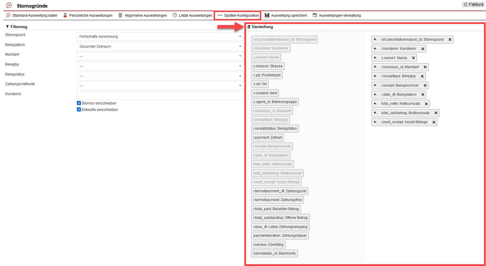 Über den Button „Spalten-Konfiguration“ [Abb. 2/5] ist es möglich, die Auswertung sowie den Umfang der Informationen schnell und einfach nach den eigenen Wünschen anzupassen [Abb. 4]. Mit nur wenigen Mausklicks lassen Sie Spalten aus der Anzeigemaske verschwinden oder fügen andere hinzu.
