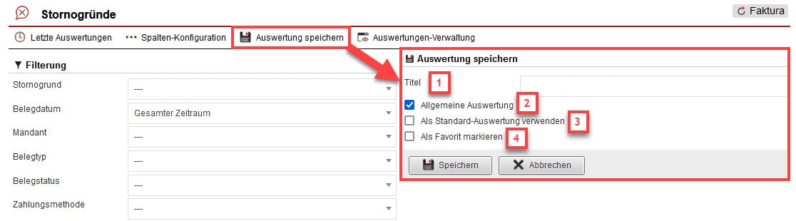 Über die Schaltfläche „Auswertung Speichern“ kann man die konfigurierte Auswertung für die Zukunft als Voreinstellung speichern, um auf diese schnell zuzugreifen. Hierfür ist die Vergabe eines Titels möglich [Abb. 5/1]. Über die folgenden Checkboxen sind genauere Konfigurationen, wie „Allgemeine Auswertung“ [Abb. 5/2], „Als Standard-Auswertung verwenden“ [Abb. 5/3] und die Option, die Auswertung als Favorit zu markieren, gegeben [Abb. 5/4]. Über die Schaltfläche „Speichern“ können die Informationen gespeichert und über die Schaltfläche „Abbrechen“ wieder verworfen werden.