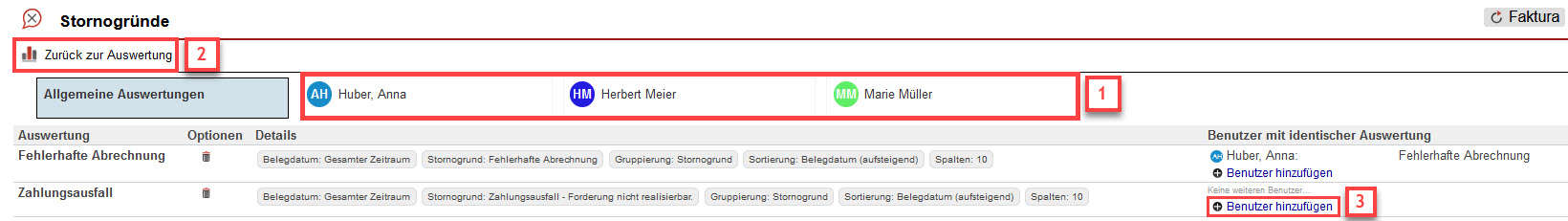 Sie sind hier in der Lage, gespeicherte Auswertungen auf Basis von Benutzern zu filtern [Abb. 6/1]. Über die Schaltfläche „Zurück zur Auswertung“ kommen Sie zur Auswertungsübersicht [Abb. 6/2]. Über die Schaltfläche „Benutzer hinzufügen“ [Abb. 6/3] weisen Sie einer vorhandenen Auswertung einen Benutzer zu.