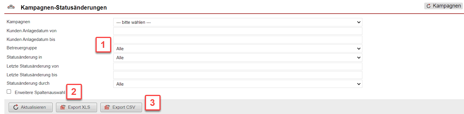 Im Statistikbereich „Kampagnen-Statusänderungen“ gibt es verschiedene Filtermöglichkeiten [Abb. 2/1]. Diese ermöglichen es, immer genau die Auswertungskonstellation anzuzeigen, welche gerade von Interesse ist. Hier können somit verschiedene, bedarfsorientierte Auswertungen erstellt werden.