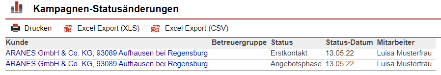 In der Statistik „Kampagnen-Statusänderungen“ finden Sie eine detaillierte Auswertung darüber, wann in den Kundendatensätzen die Änderung in welchen Vertriebskampagnenstatus durchgeführt wurde. Erreichbar ist die Statistik „Kampagnen-Statusänderungen“ im Hauptmenüpunkt „Statistik“ unter „Kampagnen“ bei „Kampagnen-Statusänderungen“.