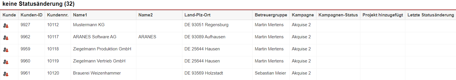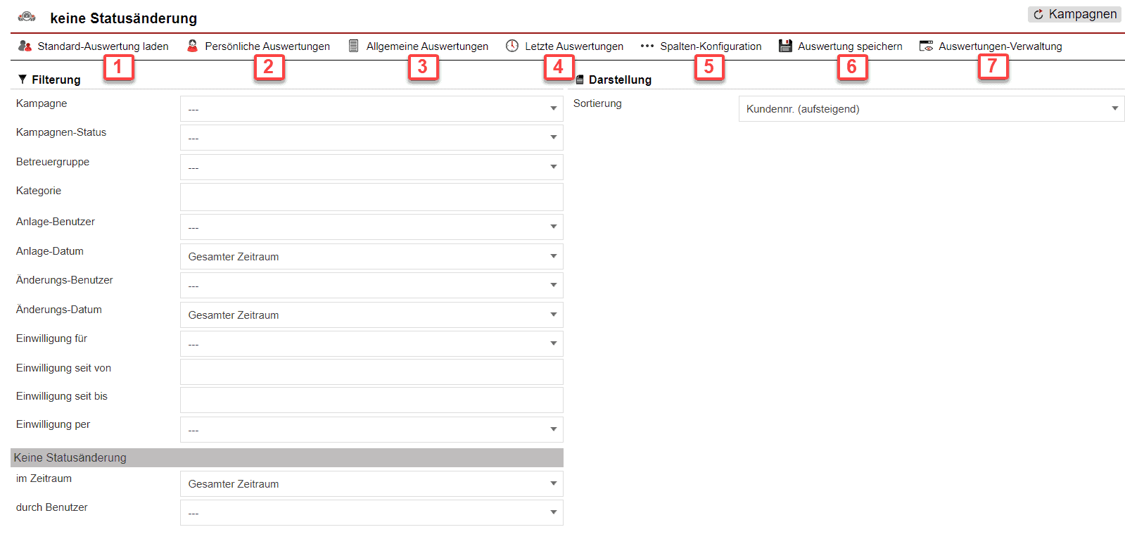 In der Statistik „Keine Statusänderung“ finden Sie eine detaillierte Auswertung darüber, bei welchen Kundendatensätzen bei bestimmten Kampagnen gar kein Status hinterlegt wurde oder bei welchen seit der ersten Hinterlegung eines Kampagnenstatus keine Änderung mehr durchgeführt wurde. Erreichbar ist die Statistik „Keine Statusänderung“ im Hauptmenüpunkt „Statistik“ unter „Kampagnen“ bei „Keine Statusänderung“.