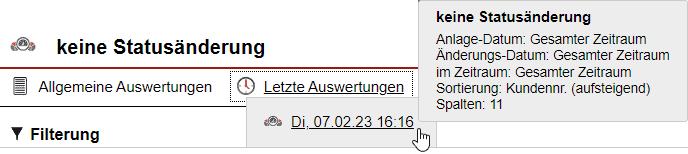 Unter „Letzte Auswertungen“ [Abb. 2/4] ist durch ein Tooltipp-Fenster ersichtlich, wann (Tag und Uhrzeit) die letzten Auswertungen durchgeführt und welche Informationen dabei abgefragt wurden.