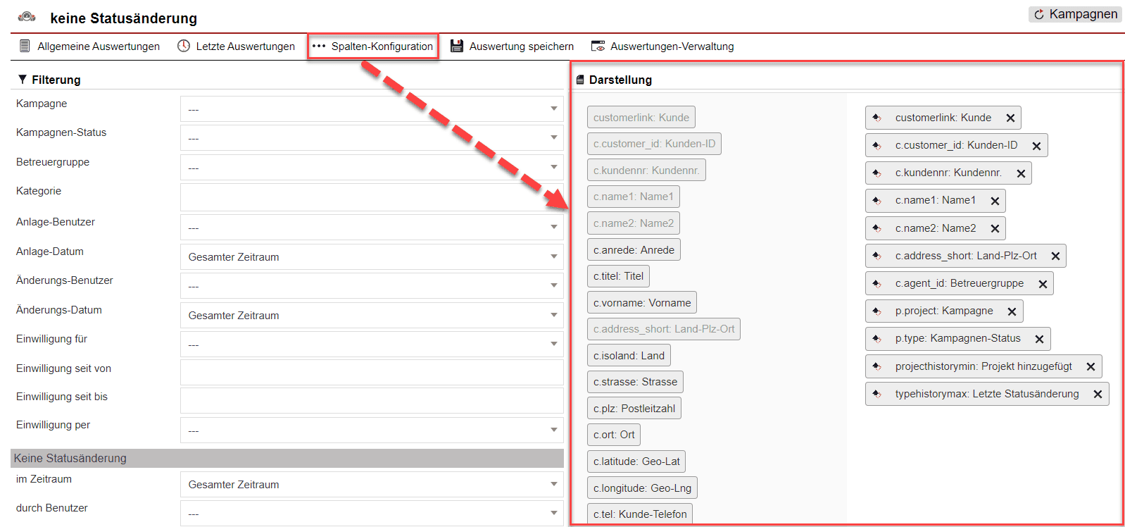 Über den Button „Spalten-Konfiguration“ [Abb. 2/5] ist es möglich, die Auswertung sowie den Umfang der Informationen schnell und einfach nach den eigenen Wünschen anzupassen [Abb. 4]. Mit nur wenigen Mausklicks lassen Sie Spalten aus der Anzeigemaske verschwinden oder fügen andere hinzu.