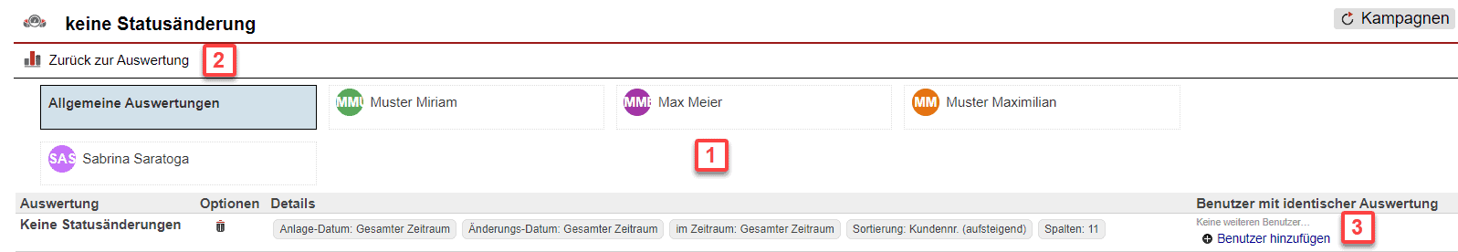 Sie sind hier in der Lage, gespeicherte Auswertungen auf Basis von Benutzern zu filtern [Abb. 6/1]. Über die Schaltfläche „Zurück zur Auswertung“ kommen Sie zur Auswertungsübersicht [Abb. 6/2]. Durch einen Klick auf „Benutzer hinzufügen“ [Abb. 6/3] weisen Sie einer vorhandenen Auswertung einen Benutzer zu.