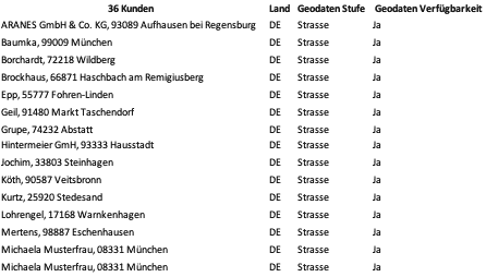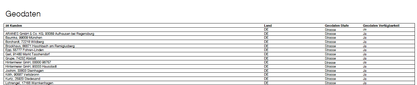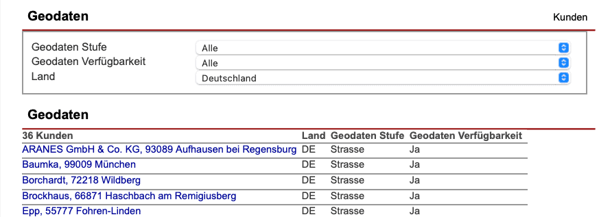 Angezeigt [Abb. 2/6] werden Kundenadressen aus den Kundendatensätzen, das Land in dem sich die Adresse befindet, die Stufe der Geodaten sowie die Verfügbarkeit der Geodaten.