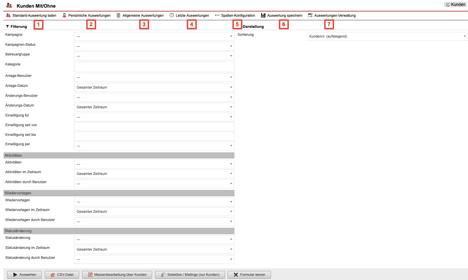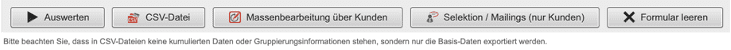 - Massenbearbeitung über Kunden: Über diese Funktion kann auf Basis der abgefragten Daten eine Massenbearbeitung der Kundendaten vorgenommen werden.