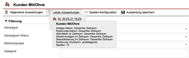 Über „Allgemeine Auswertungen“ [Abb. 2/3] können gespeicherte Auswertungen die als „Allgemeine Auswertung“ [Abb. 5/2] gekennzeichnet worden sind, über ein Tooltipp-Menü abgerufen werden.