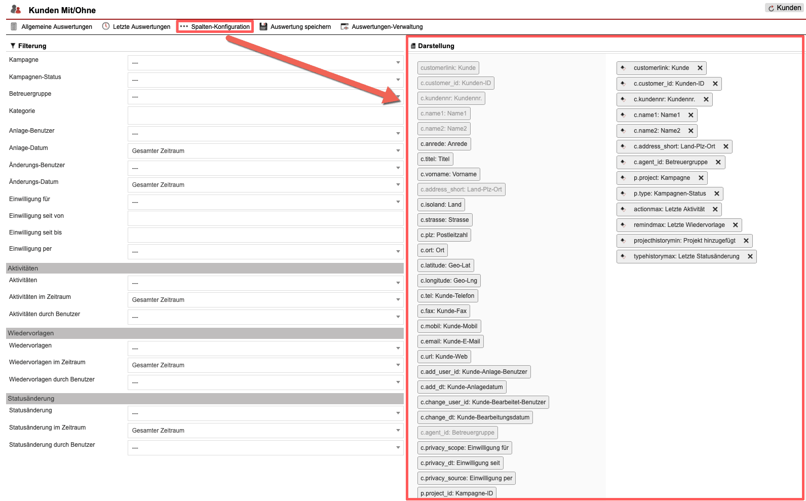 Über den Button „Spalten-Konfiguration“ [Abb.2/5] ist es möglich, die Auswertung sowie den Umfang der Informationen schnell und einfach nach den eigenen Wünschen anzupassen [Abb.4]. Mit nur wenigen Mausklicks lassen Sie Spalten aus der Anzeigemaske verschwinden oder fügen andere hinzu.