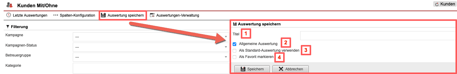 Über die Schaltfläche „Auswertung Speichern“ kann man die konfigurierte Auswertung für die Zukunft als Voreinstellung speichern, um auf diese schnell zuzugreifen. Hierfür ist die Vergabe eines Titels machbar [Abb. 5/1]. Über die folgenden Checkboxen sind genauere Konfigurationen, wie „Allgemeine Auswertung“ [Abb. 5/2], „Als Standard-Auswertung verwenden“ [Abb. 5/3] und die Möglichkeit, die Auswertung als Favorit zu markieren gegeben [Abb. 5/4]. Über die Schaltfläche „Speichern“ können die Informationen gespeichert und über die Schaltfläche „Abbrechen“ wieder verworfen werden.