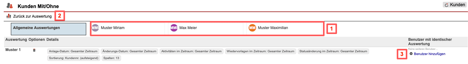 Sie sind hier in der Lage, gespeicherte Auswertungen auf Basis von Benutzern zu filtern [Abb. 6/1]. Über die Schaltfläche „Zurück zur Auswertung“ kommen Sie zur Auswertungsübersicht [Abb. 6/2]. Über die Schaltfläche „Benutzer hinzufügen“ [Abb. 6/3] weisen Sie einer vorhanden Auswertung einen Benutzer zu.