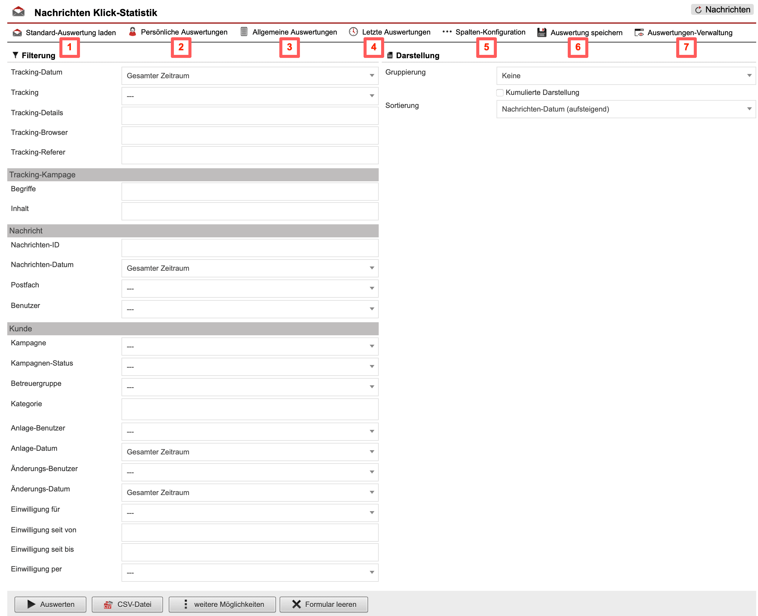 Im Statistikbereich „Nachrichten Klick-Statistik“ gibt es eine sehr große Anzahl an Filtermöglichkeiten [Abb.2]. Diese ermöglicht es, immer genau die Auswertungskonstellation anzuzeigen, welche gerade von Interesse ist. Hier können somit verschiedene bedarfsorientierte Auswertungen erstellt werden.
