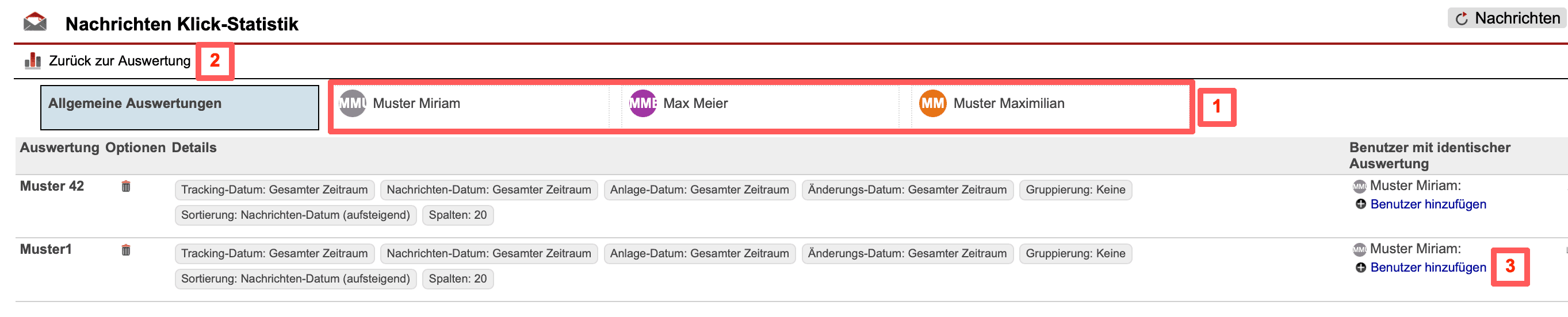 Sie sind hier in der Lage, gespeicherte Auswertungen auf Basis von Benutzern zu filtern [Abb. 6/1]. Über die Schaltfläche „Zurück zur Auswertung“ kommen Sie zur Auswertungsübersicht [Abb. 6/2]. Über die Schaltfläche „Benutzer hinzufügen“ weisen Sie einer vorhanden Auswertung einen Benutzer zu [Abb. 6/3].