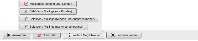 Über diese Funktion kann auf Basis der abgefragten Daten eine Massenbearbeitung der zugehörigen Kundendatensätze vorgenommen werden. - Selektion/Mailings (nur Kunden):