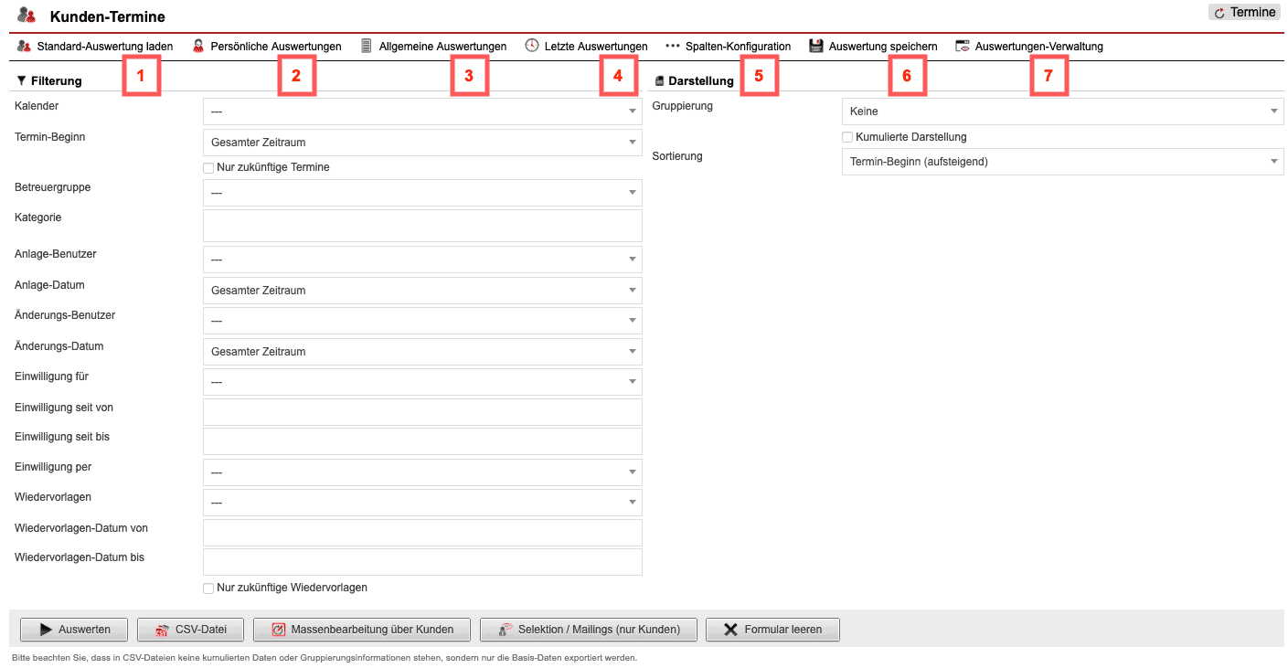 In der „Kunden-Termine-Statistik“ finden Sie eine detaillierte Auswertung der im System hinterlegten Kunden-Termin-Einträge nach verschiedenen Kriterien. Erreichbar ist die „Kunden-Termin-Statistik“ im Hauptmenüpunkt „Statistik“ unter „Termine“, bei „Kunden-Termine“.