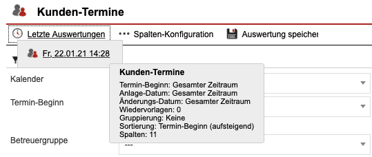 Über „Allgemeine Auswertungen“ [Abb. 2/3] können gespeicherte Auswertungen die als „Allgemeine Auswertung“ [Abb. 5/2] gekennzeichnet worden sind, über ein Tooltipp-Menü abgerufen werden.