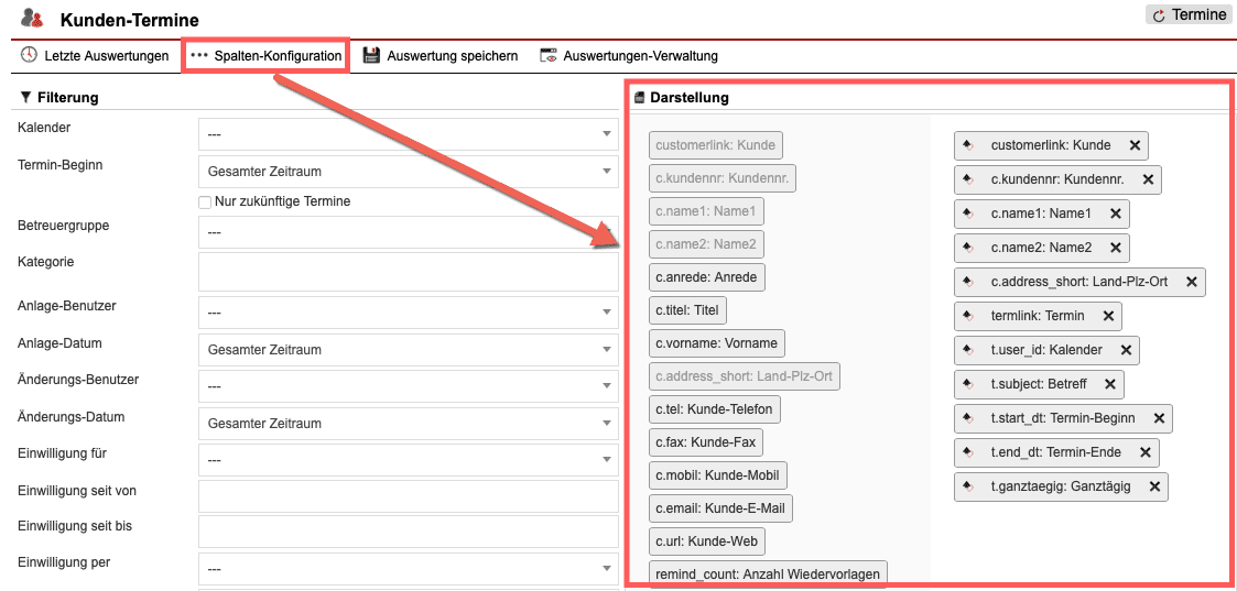 Über den Button „Spalten-Konfiguration“ [Abb.2/5] ist es möglich, die Auswertung sowie den Umfang der Informationen schnell und einfach nach den eigenen Wünschen anzupassen [Abb.4]. Mit nur wenigen Mausklicks lassen Sie Spalten aus der Anzeigemaske verschwinden oder fügen andere hinzu.