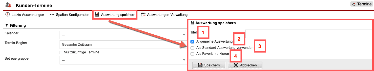 Über die Schaltfläche „Auswertung Speichern“ kann man die konfigurierte Auswertung für die Zukunft als Voreinstellung speichern, um auf diese schnell zuzugreifen. Hierfür ist die Vergabe eines Titels machbar [Abb. 5/1]. Über die folgenden Checkboxen sind genauere Konfigurationen, wie „Allgemeine Auswertung“ [Abb. 5/2], „Als Standard-Auswertung verwenden“ [Abb. 5/3] und die Möglichkeit, die Auswertung als Favorit zu markieren gegeben [Abb. 5/4]. Über die Schaltfläche „Speichern“ können die Informationen gespeichert und über die Schaltfläche „Abbrechen“ wieder verworfen werden.