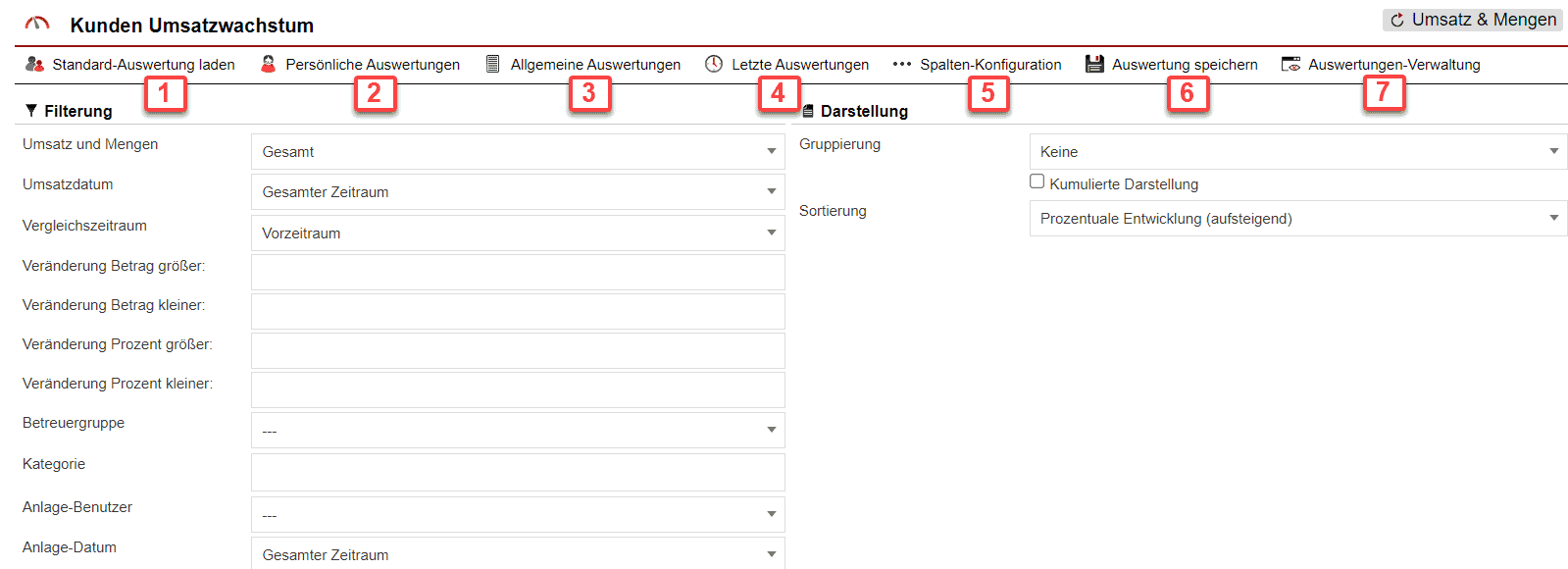 Im Statistikbereich „Kunden Umsatzwachstum“ gibt es eine große Anzahl an Filtermöglichkeiten [Abb. 2]. Diese ermöglicht es, immer genau die Auswertungskonstellation anzuzeigen, welche gerade von Interesse ist. Hier können somit verschiedene, bedarfsorientierte Auswertungen erstellt werden.
