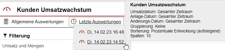 Über „Allgemeine Auswertungen“ [Abb. 2/3] können gespeicherte Auswertungen die als „Allgemeine Auswertung“ [Abb. 5/2] gekennzeichnet worden sind, über ein Tooltipp-Menü abgerufen werden.